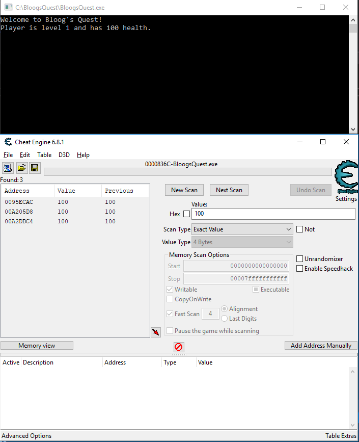 But how do we find the memory address of our Game pointer? We could simply use C++'s & (address-of) operator, but that isn't an option for games where we don't have access to the source code (which is almost always the case). Instead, we turn to a memory scanner. The one I'm familiar with using is called Cheat Engine. Cheat Engine searches the program's memory at runtime, allowing us to pinpoint the memory addresses of values we're interested in. In our case, we're going to use it to find the memory address of our Player's health. What we actually want is the memory address of our Game pointer, because that's not going to change between program runs, but the way we're going to find that is by searching for the Player's health, then walking back the pointer chain to get to the Game pointer.