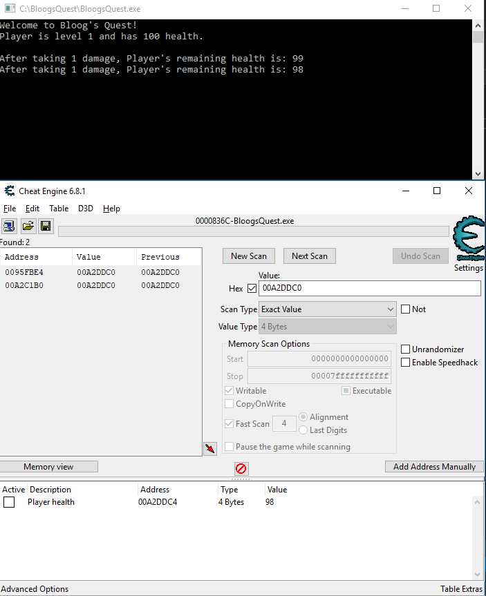 You should get two hits. Notice that one of them is green. Cheat Engine has identified this as a static pointer. The memory address of this pointer, relative to the base address of your process, will not change between runs of your program. This allow us to consistently find the memory address of our Player's health by following the pointer chain. To find the correct offset from the base address of your process, double click that green address 00F6C2D0 to add it to the table at the bottom, then double click the entry at the bottom. The UI is sorta weird, but if you scroll around in that textbox you should see BloogsQuest.exe+1C2D0. 1C2D0 is the offset from the base address of our process that will allow us to consistently find out Game pointer: